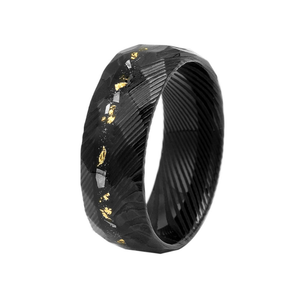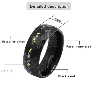 Authentic meteorite chips and 24K gold foil are embedded within layers of black sand, giving the piece a rare mix of earthly strength and celestial history. No two rings are ever identical—each one displays its own natural patterns, metallic fractures, and gold accents.