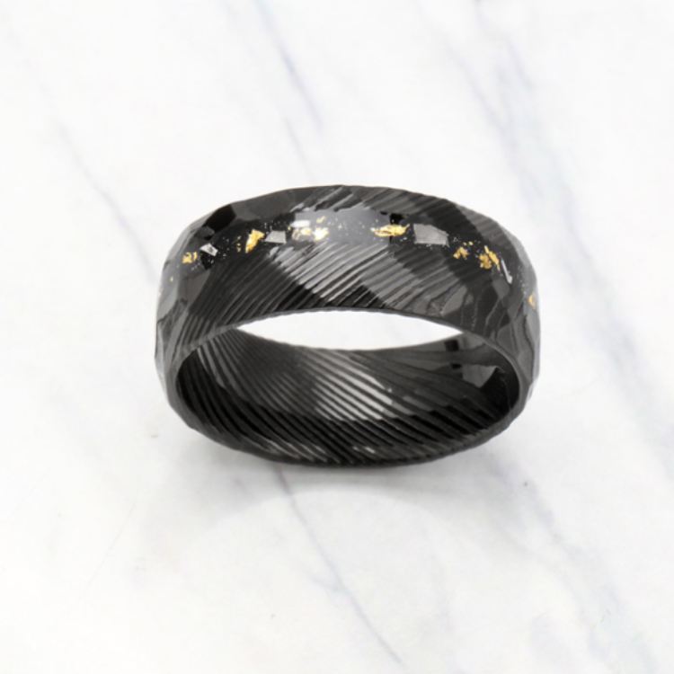 The Men’s Meteorite & Gold Damascus Ring is a bold fusion of craftsmanship, cosmic material, and modern masculine design. Precision-forged in Damascus steel, this ring features a unique facet-hammered finish, creating deep texture and striking light reflections from every angle.