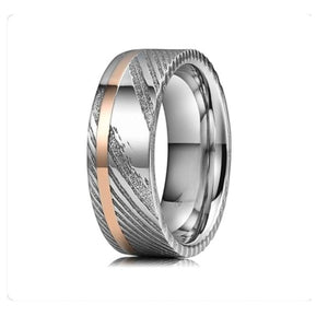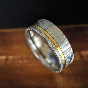 A sleek gold-toned inlay slices cleanly through the patterned steel, creating a bold contrast between raw forged detail and refined metallic warmth. At 8mm wide and shaped with a comfort-fit interior, it sits solidly on the hand while remaining smooth, balanced, and exceptionally comfortable for daily wear.