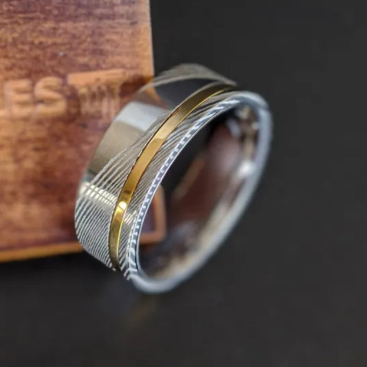 The 8mm Helios Damascus Steel & Gold Inlay Ring is a striking blend of modern craftsmanship and timeless masculine style. Forged from premium Damascus steel, the ring displays dynamic, wave-carved patterns that catch the light and give the metal a rugged, organic texture.