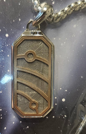 Own a piece of the universe with this striking Aletai Meteorite Pendant, crafted from genuine meteorite and framed in polished stainless steel with gold-plated geometric detailing.