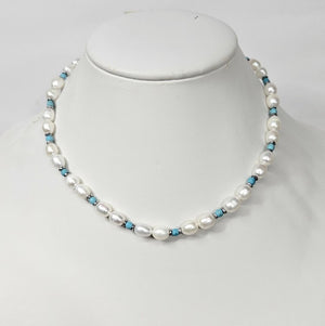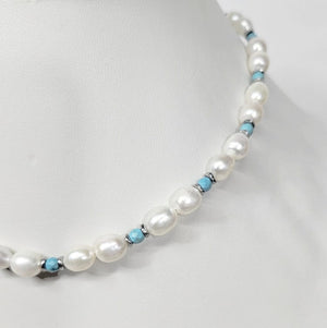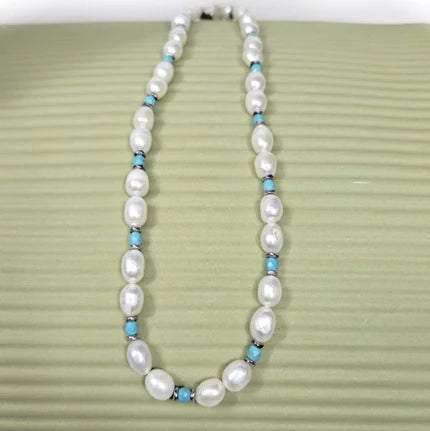 A refined expression of natural beauty and vibrant charm, this handcrafted necklace features lustrous 10x6.5mm freshwater pearls paired with bold 5mm turquoise spacer beads. The vivid contrast of pearl and turquoise delivers a fresh, contemporary take on timeless elegance—perfect for both casual and elevated styling.