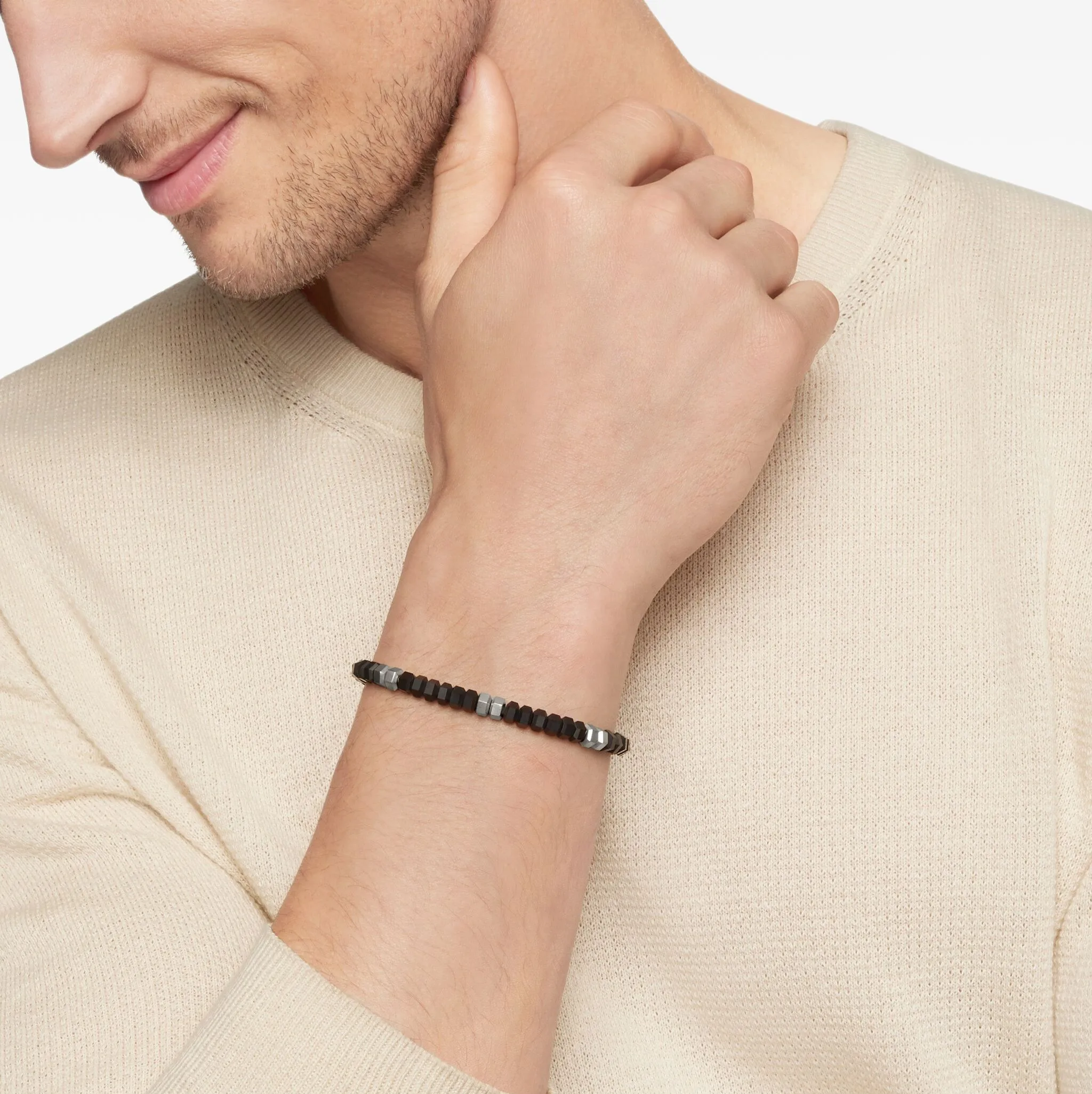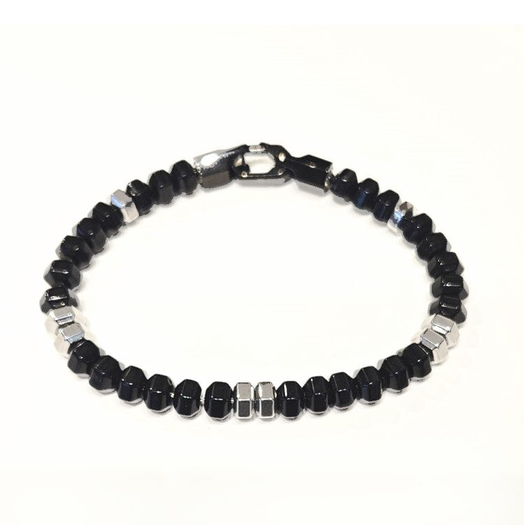 Black Agate Hexagonal Bead Bracelet with Stainless Steel Accents