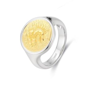 Its polished silver body highlights the golden crest, creating a striking contrast that reflects both strength and refinement. Designed with smooth contours and a bold oval face, the ring offers a balanced weight and a comfortable, secure fit suitable for everyday wear or special occasions.
