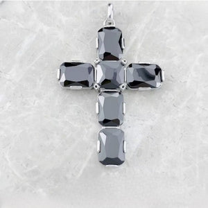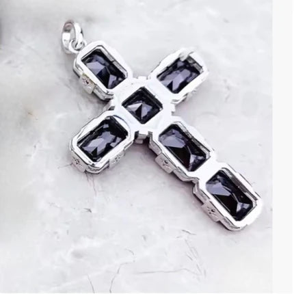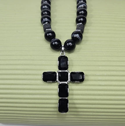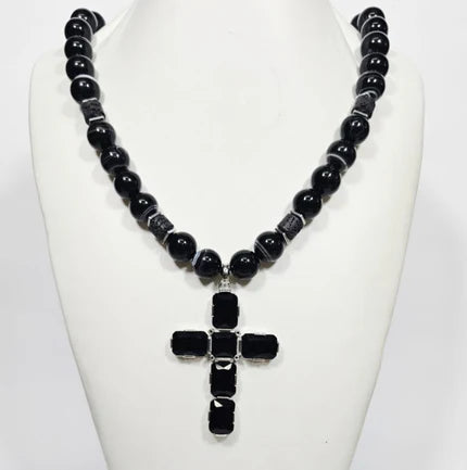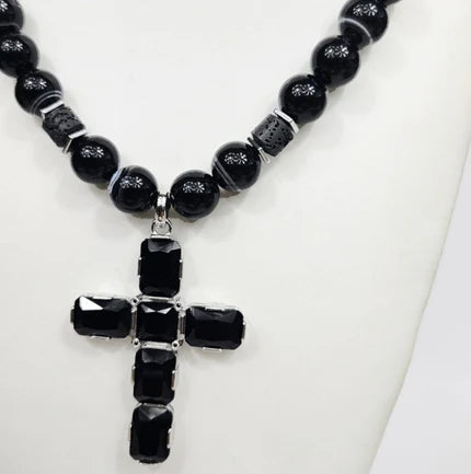 Elevate your style with this exquisite Large Silver Cross Necklace, featuring a bold cross pendant adorned with radiant Black Austrian crystals, elegantly strung on a luxurious Botswana agate beaded necklace with Lava spacer beads. A perfect fusion of faith and fashion, this handcrafted piece exudes sophistication and timeless charm.