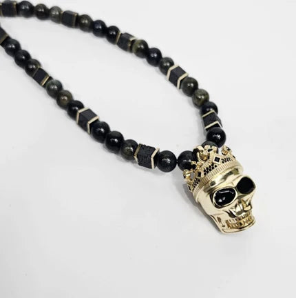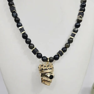 This bold Large Silver Gold-Plated Skull with Crown Necklace, featuring a striking 40x22mm skull pendant, elegantly strung on a luxurious 8mm dark blue gray tiger eye beaded necklace. A perfect fusion of power and elegance, this handcrafted piece exudes sophistication and edgy charm.