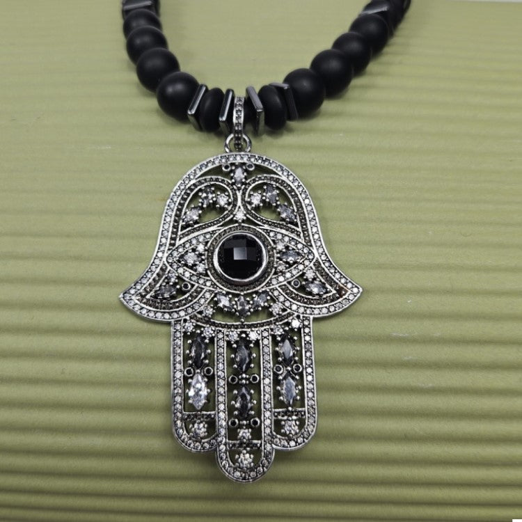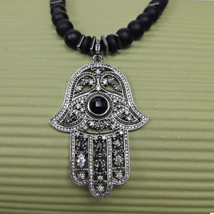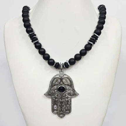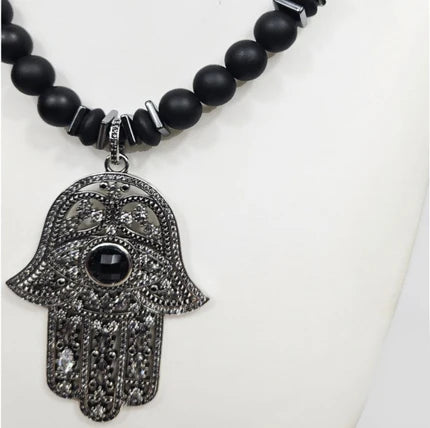 Large Silver Hand Of Hemsa Austrian Crystals Strang on Matte Onyx beaded necklace