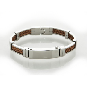 Polished Stainless Steel Bracelet with Double Strand Braided Tan Leather