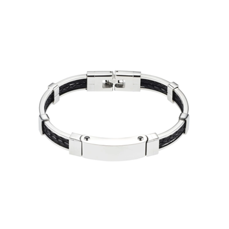 Polished Stainless Steel Bracelet with Double Strand Braided Black Leather