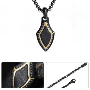 This pendant features a forged carbon fiber inlay, creating a bold marbled texture framed by high-polish stainless steel and accented with precision-set CZ stones for a subtle edge of brilliance.