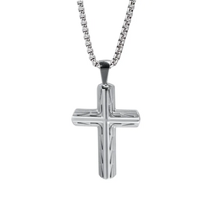 A sleek stainless steel cross with intricately sculpted side detailing, offering a distinctive and elegant aesthetic.
