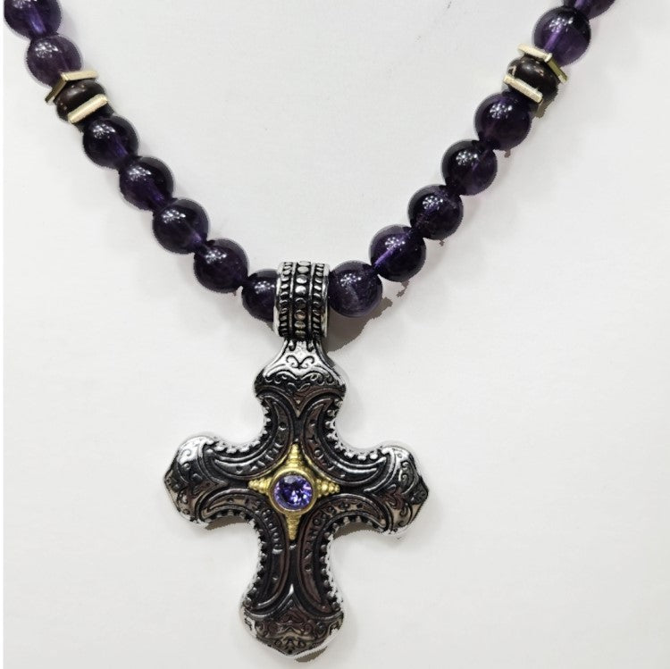 Stainless Steel Cross with Amethyst Crystal Strang on Amethyst Beaded Necklace