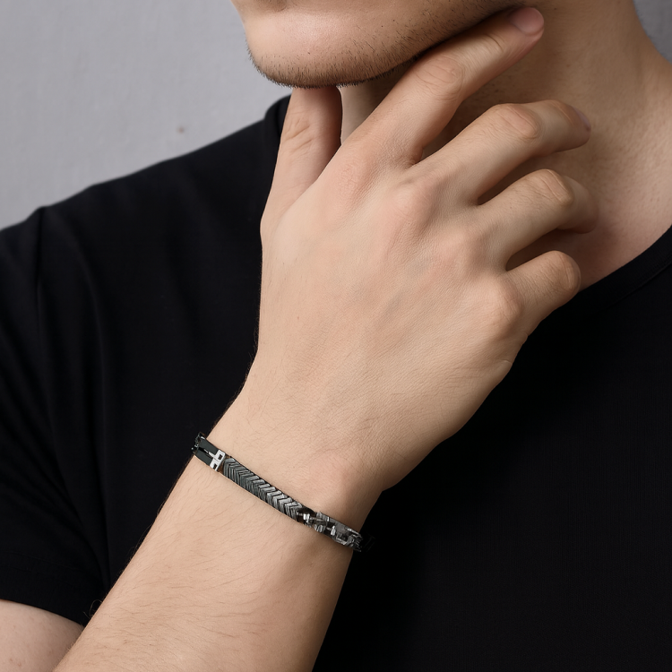 Refined and masculine, this bracelet blends modern design with durable materials. Crafted from high-grade stainless steel and finished in sleek black PVD plating, it features a bold ceramic ID segment with a chevron texture, paired with polished silver-toned interlocking links in a geometric motif. The compact 5.5mm width offers a streamlined profile, while the adjustable length (19–22cm with extra links) ensures a comfortable fit for most wrists.