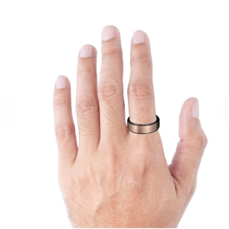 Bold, modern, and built to last—this 8mm Black & Rose Gold Tungsten Carbide Ring combines rugged texture with sophisticated design. Featuring a Honeycomb rose gold groove across the sleek black shank, this ring is a standout piece for the man who appreciates strength and style in perfect harmony.