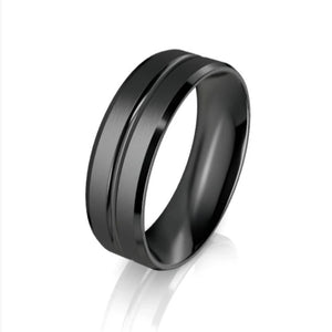 Elevate your commitment with a ring that blends sleek minimalism and rugged durability. The Black Zirconium Wedding Band is an 8mm-wide masterpiece of modern design — combining a brushed satin center groove with polished beveled edges and a deep black finish. It’s the perfect choice for the man who appreciates both understated elegance and strength.