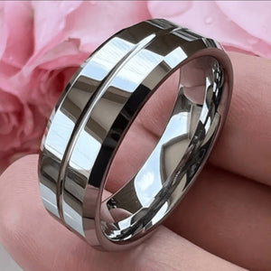 Crafted for the man who values classic design with a bold edge, this Silver Tungsten Carbide Ring is a true statement in masculine refinement. Its high-polish finish across the center and edges delivers a sleek, mirror-like shine, while the beveled edges and comfort-fit band make it as wearable as it is striking.