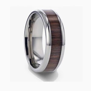 A distinctive blend of polished silver tungsten carbide and natural wood inlay, this 8mm ring offers strength with a touch of earthy elegance. Each wood inlay features unique grain and color variations, making every ring one-of-a-kind. The beveled edges and comfort-fit design ensure all-day wearability.