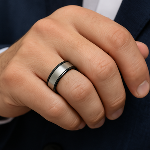 This striking men’s wedding band is crafted from premium black zirconium with a dark grey finish. Known for its incredible durability and corrosion resistance, black zirconium offers a bold yet refined aesthetic. Its minimalist flat profile and polished black sleeve give the ring a sleek, modern edge—perfect for someone who wants their ring to stand out.