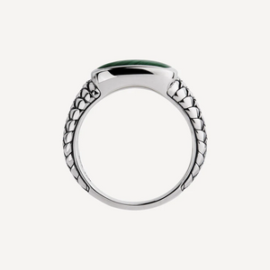 Handcrafted in 925 Sterling Silver, this commanding piece features an inlaid green malachite, a stone revered for centuries as the Stone of Transformation. Its rich bands of green symbolise growth, balance, and protection, making it the perfect companion for the man who forges his own path.
